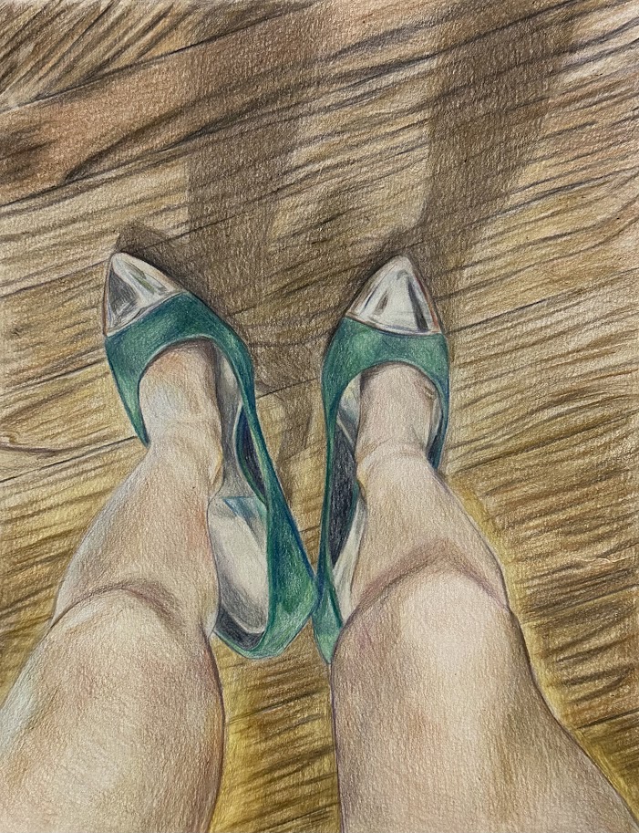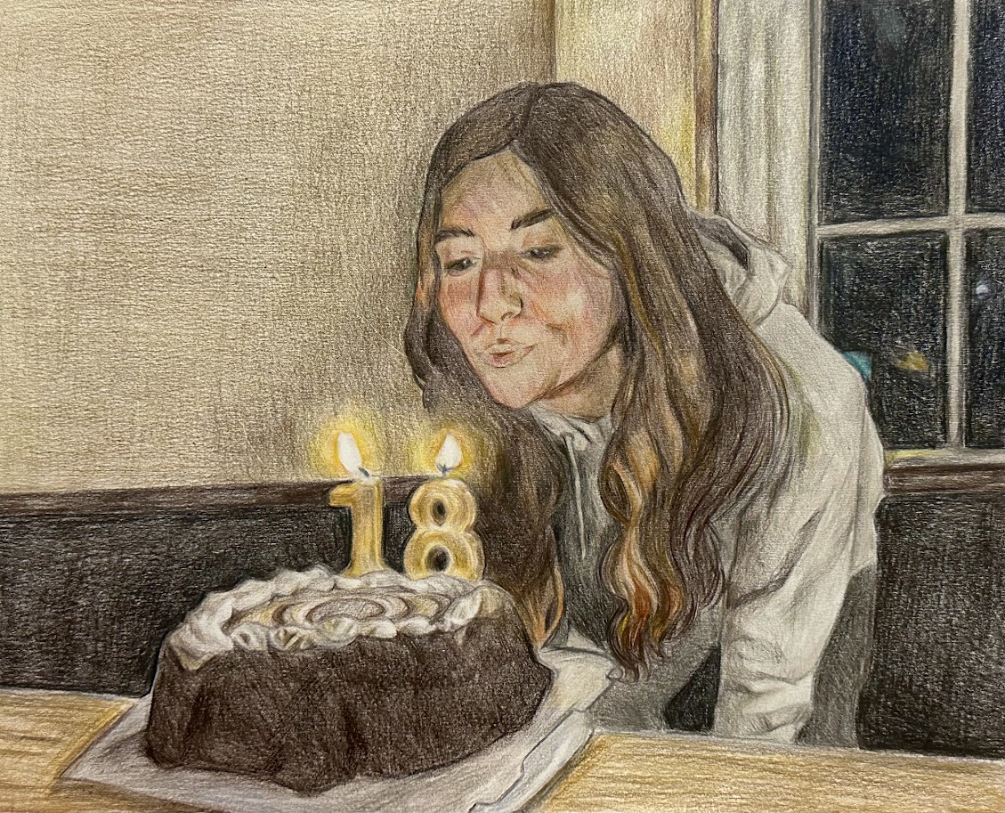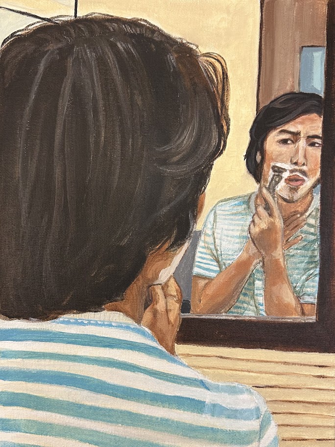 Graduation is an acrylic painting shown from a first-person perspective. The arm is reaching toward the sky after tossing a graduation cap. This piece represents the moment of transition after graduation, when the protection of the school ends, and independence begins.