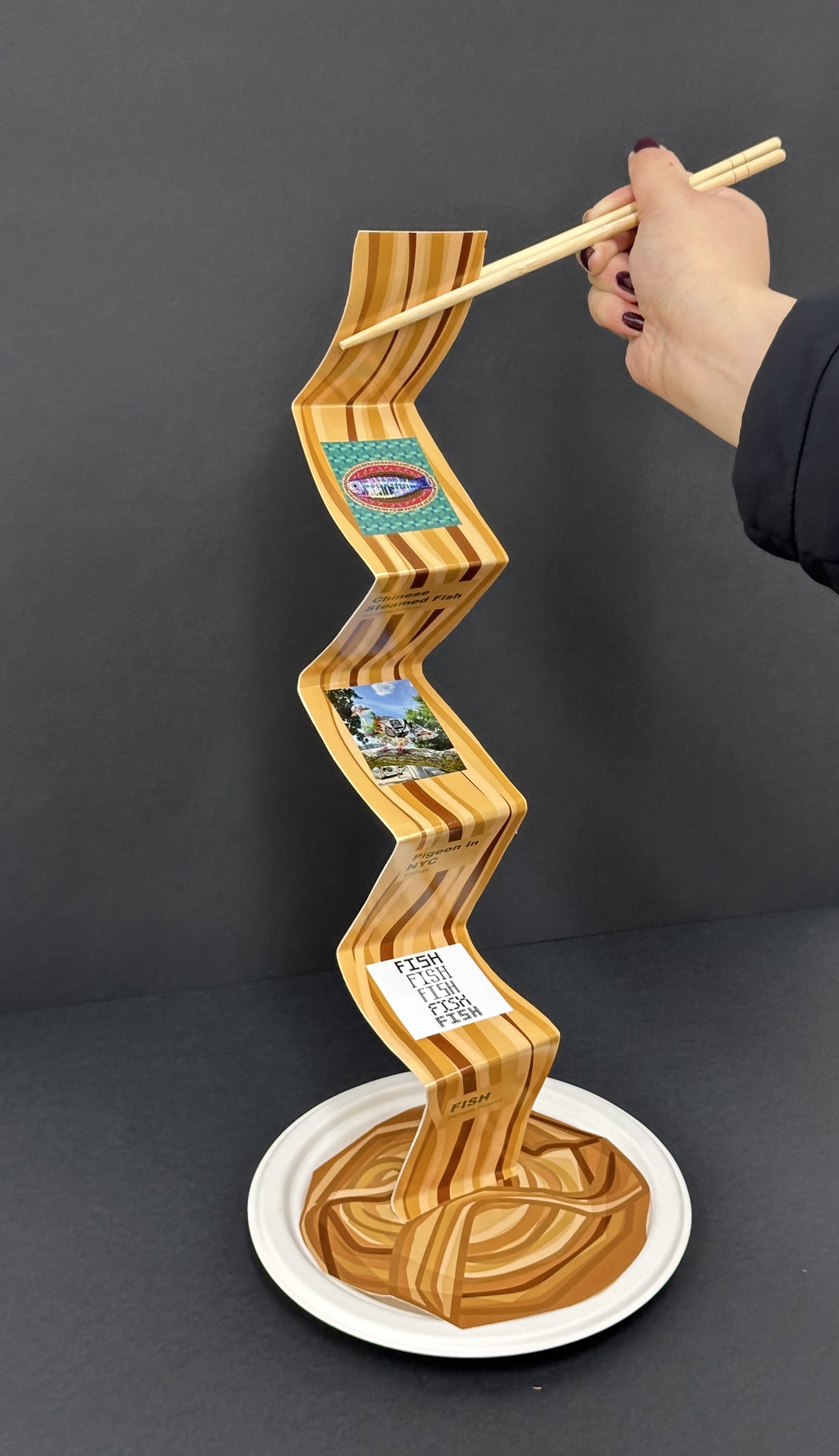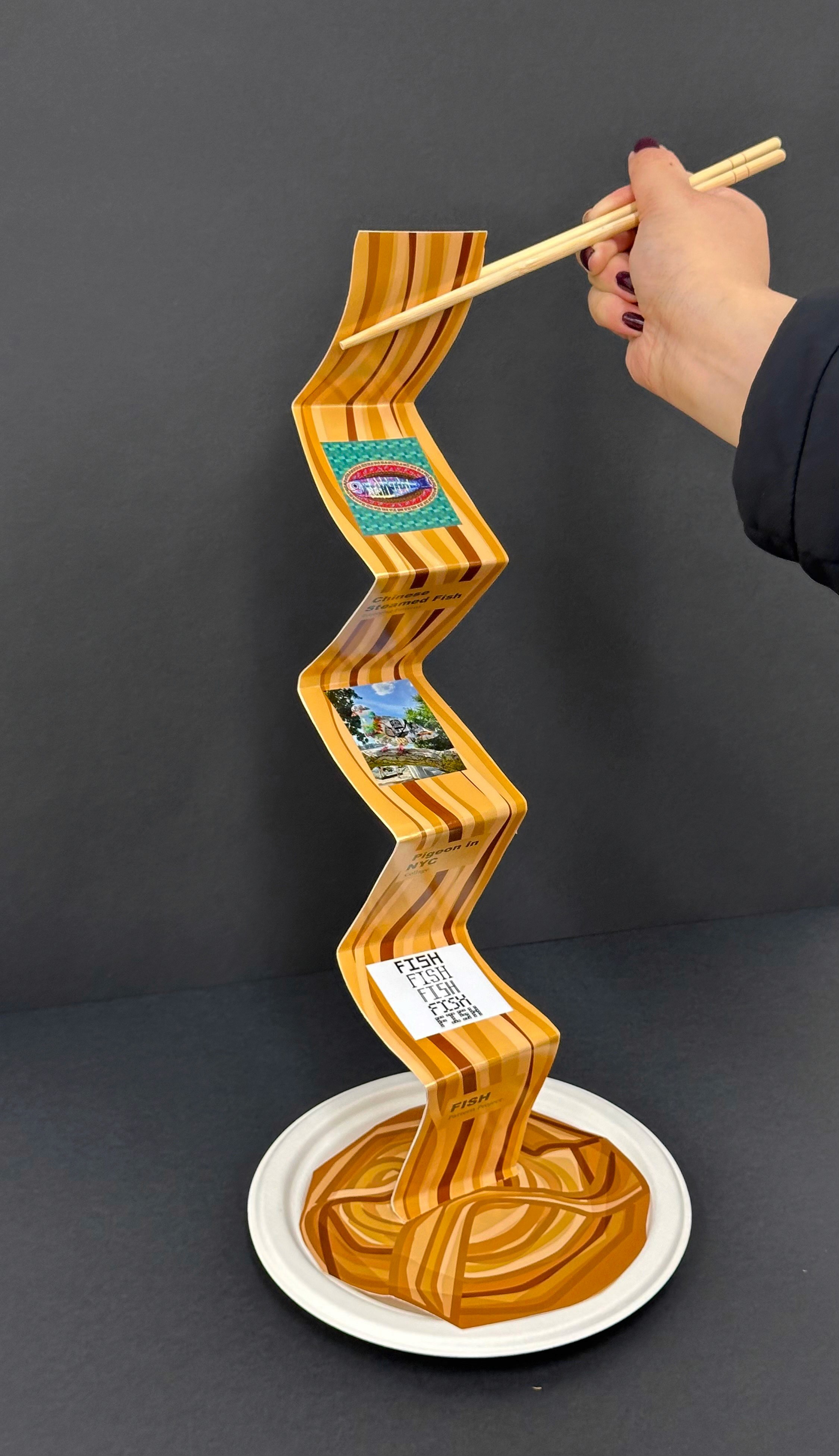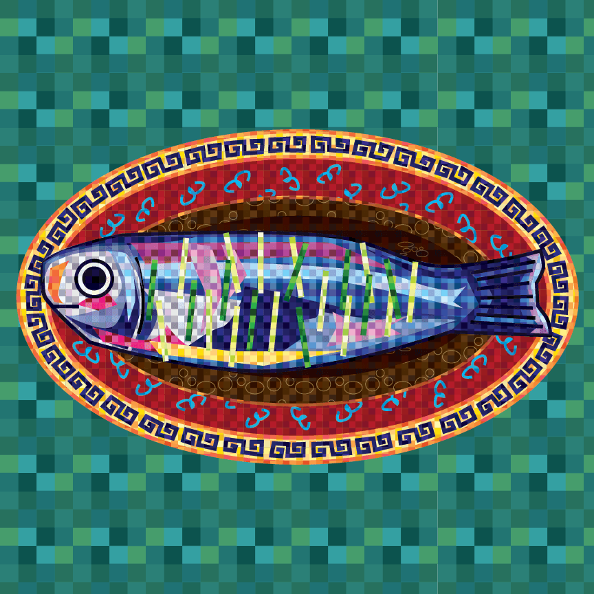 This piece reflects my Chinese American heritage by combining the traditional steamed fish, a symbol of luck in Chinese culture, with bright, nontraditional melamine plates common in Chinese American restaurants.